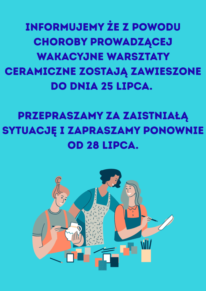 Z powodu choroby prowadzącej, do 25 lipca, odwołujemy zajęcia ceramiki, odbywające się w MSK: Widzew- Wschód Domu Kultury 502. Przepraszamy za zaistniałą sytuację i zapraszamy ponownie 28 lipca.