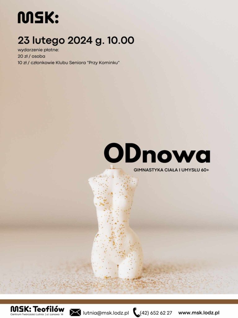 23 lutego 2024 / 10.00 „ODnowa” -Gimnastyka ciała i umysłu 60+ to program ćwiczeń usprawniających ruch oraz stymulujące ćwiczenia umysłu. Dzięki ćwiczeniom poprawia się kondycja fizyczna i mentalna. Stajemy się sprawniejsi ruchowo i szybciej rozwiązujemy krzyżówki. Mamy też niezwykłą okazję do spotkania, rozmów i radości w gronie rówieśniczym. Zajęcia trwają 60 min. wstęp płatny: 20 […]
