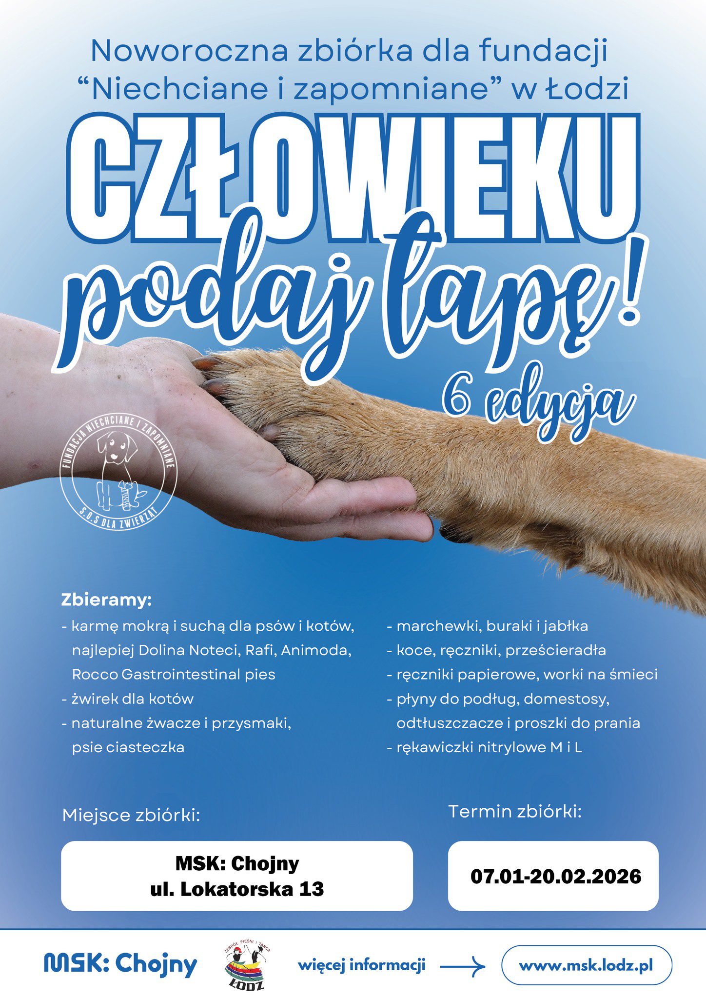 22.02.2026r. 11.00 am – finał akcji „Człowieku podaj łapę” – koncert charytatywny zrealizowany na sali widowiskowej MSK: Chojny – Centrum Kultury Młodych – koncertowi towarzyszyć będzie zbiórka pokarmów i akcesoriów dla Fundacji „Niechciane – Zapomniane”