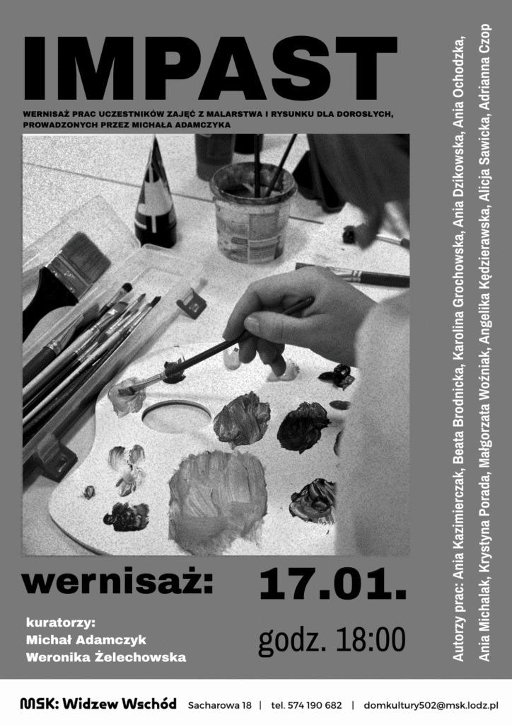 Wernisaż odbędzie się 17 stycznia o godz. 18:00 w MSK: Widzew Wschód – Domu Kultury 502, w przy ulicy Andrzeja Sacharowa 18 w Łodzi.