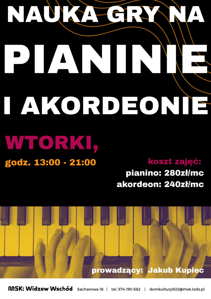 Prowadzący: Jakub Kupiec jest absolwentem Akademii Muzycznej w Katowicach, nauczycielem gry na pianinie i akordeonie. Na zajęciach stawia na indywidualne podejście, cierpliwość i radość z odkrywania muzyki.