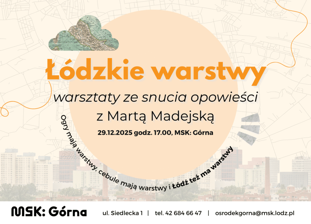 Ogry mają warstwy, cebule mają warstwy i Łódź też ma warstwy – ich częścią jesteśmy również my i nasze domy kultury. Podczas warsztatów prowadzonych przez Martę Madejska będziemy wykorzystywać mapy mentalne i geograficzne, historie mówione i własne wspomnienia żeby opowiedzieć sobie o tym jak wielka historia przeplata się z naszym życiowym doświadczeniem, a czasem płynie mimo niego. Będziemy rozmawiać, pisać