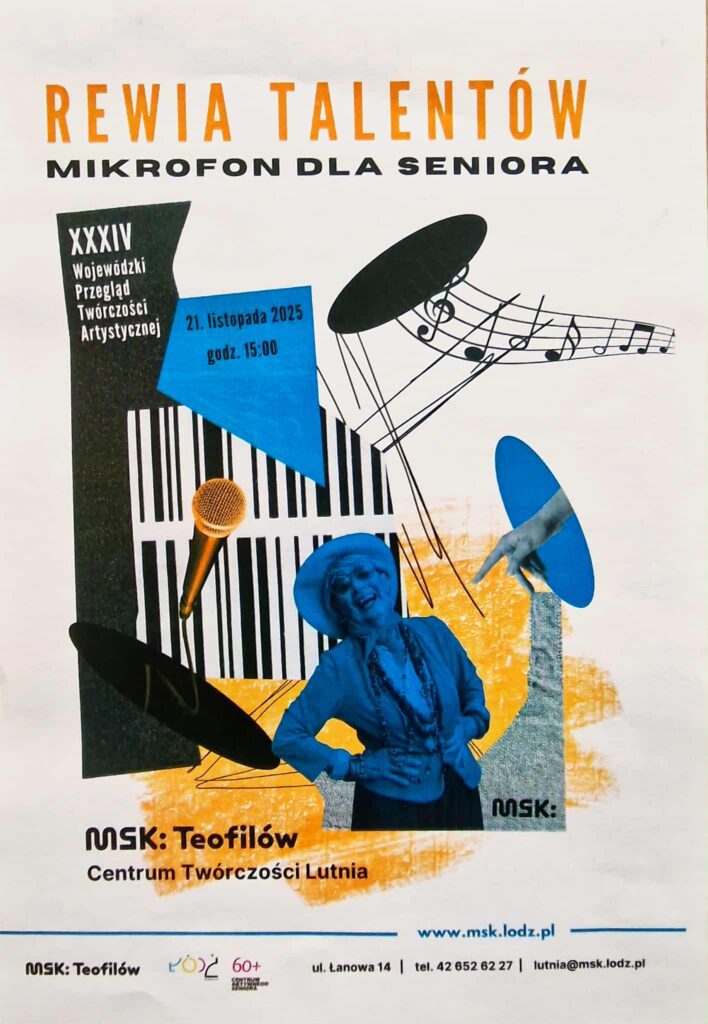 21 listopada 2025 start | g. 15.00 Rewia Talentów „Mikrofon dla Seniora” to niezwykłe święto sztuki i pasji, które już po raz XXXIV odbędzie się w MSK: Teofilów – Centrum Twórczości Lutnia. To tutaj 21 listopada 2025 roku spotkają się seniorzy, by udowodnić, że wiek nie ma żadnego znaczenia, gdy w sercu gra muzyka, a dusza wciąż pragnie sceny. To