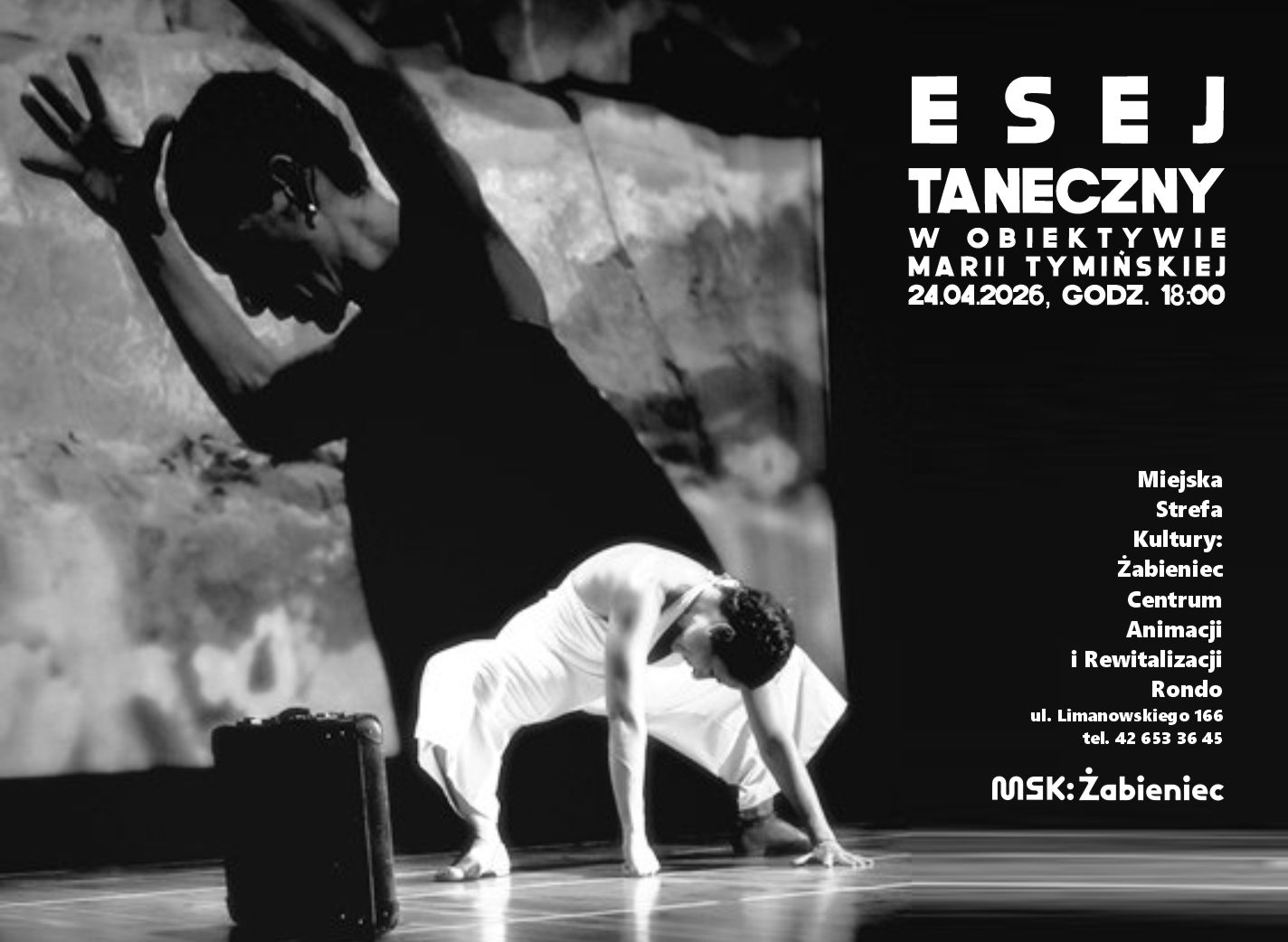 Seria zdjęć zatytułowana „Esej taneczny” jest retrospekcją fantastycznego występu, czołowej tancerki Ameryki Środkowej Karli Trad w 2022 roku, na scenie Domu Kultury w Łęczycy. Pokaz artystki odbył się w ramach Festiwalu Sztuki im. Asi Kowalczewskiej. To wyjątkowe wydarzenie uchwyciła na swoich czarno-białych fotografiach Maria Tymińska, pasjonatka fotografii, prowadząca Pracownię Fotografii Artystycznej w MSK: Żabieniec.