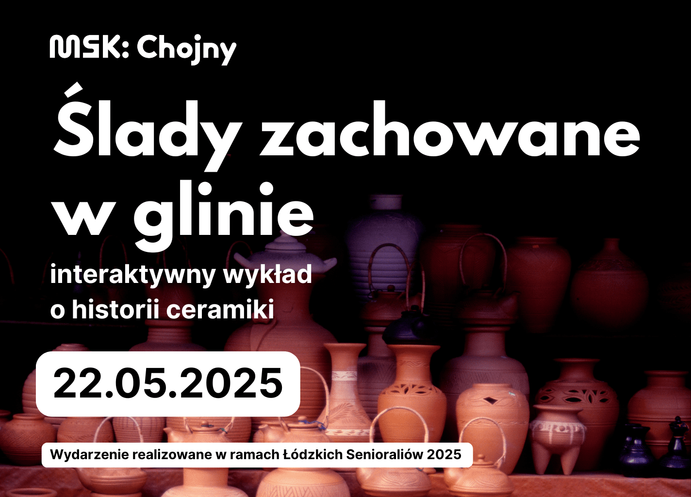 -odkryj genezę ceramiki-poznaj przykłady dawnych dzieł-poczuj glinę własnymi dłońmiProwadząca: Aleksandra Śmiech rzeźbiarka i historyczka sztuki. Absolwentka kierunku rzeźba na ASP w Łodzi oraz Historii Sztuki na KUL, członkini łódzkiego stowarzyszenia „Mozaic”.Wydarzenie realizowane w ramach Łódzkich Senioraliów 2025.
