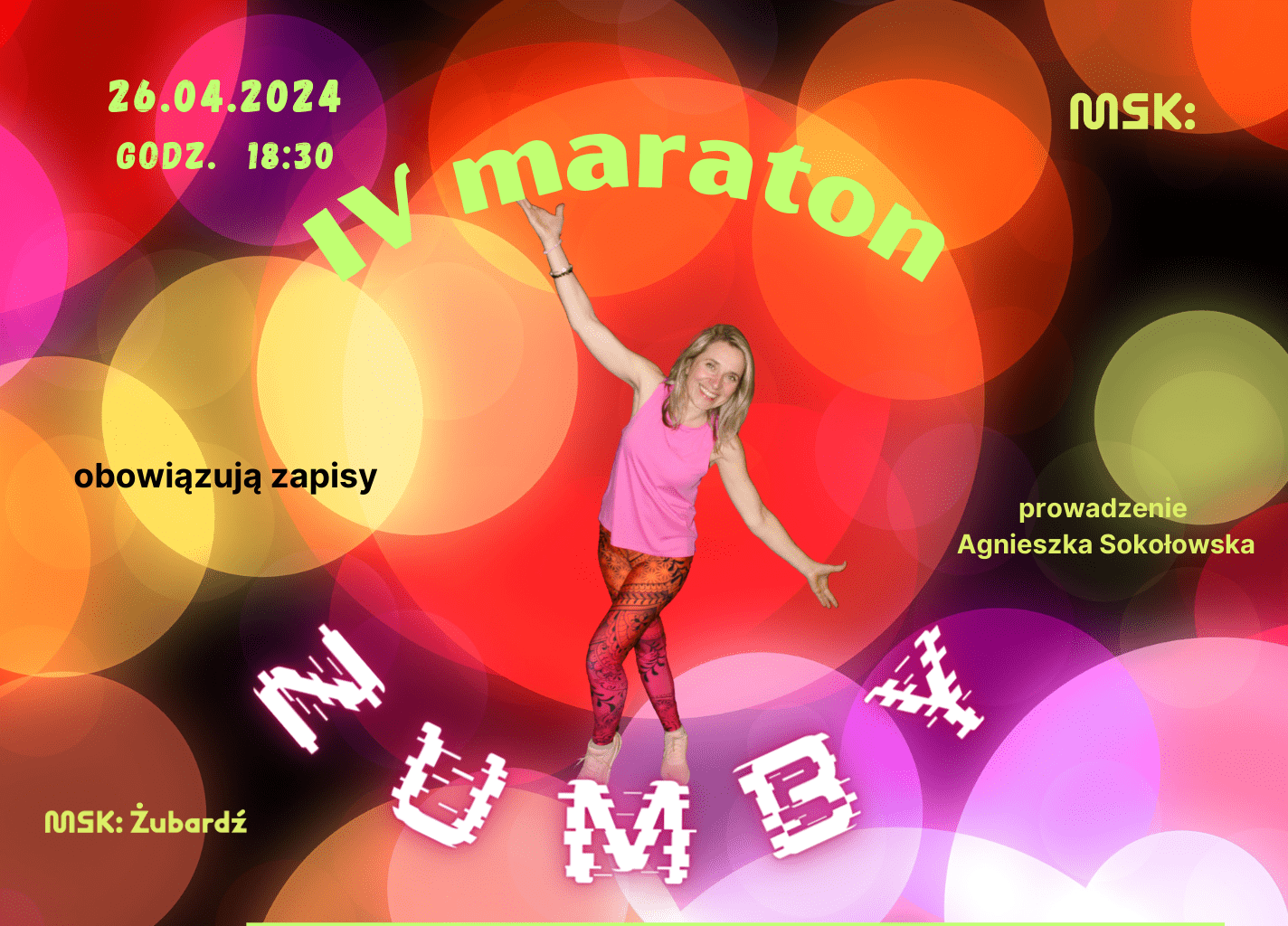 W ramach Międzynarodowego Dnia Tańca, zapraszamy na IV Maraton Zumby, który odbędzie się 26 kwietnia 2024 w MSK: Żubardź, CEK „Na Żubardzkiej” Maraton poprowadzi nasza instruktorka Agnieszka Sokołowska, która wprowadzi uczestników w wiraż tanecznej zumby. Maraton skierowany jest do osób w każdym wieku, niezależnie od kondycji fizycznej i doświadczenia w tańcu. Zapraszamy zapisujcie się na naszej stronie, prosimy również o potwierdzenia telefoniczne. (nr tel. 42 6516747, 501180652)