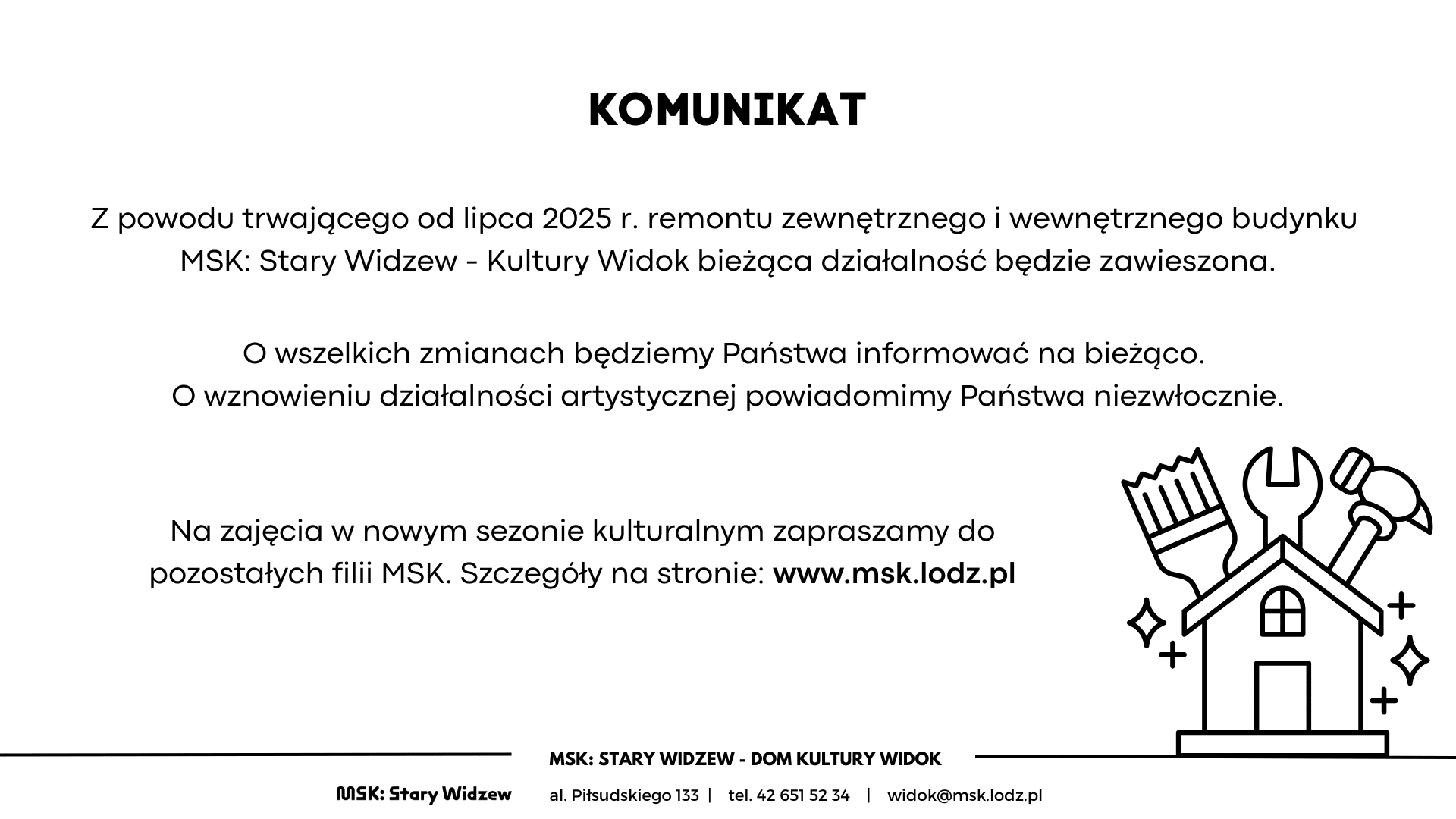 Z powodu trwającego od lipca 2025 r. remontu zewnętrznego i wewnętrznego budynku MSK: Stary Widzew – Kultury Widok bieżąca działalność będzie zawieszona.