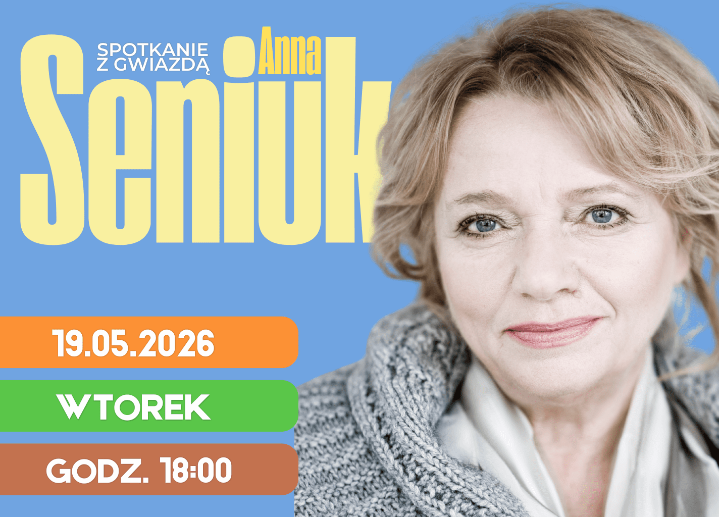 Zapraszamy  19 maja na godz. 18:00 na Spotkanie z Gwiazdą, tym razem gościem będzie Anna Seniuk – aktorka teatralna, filmowa i telewizyjna. Absolwentka Państwowej Wyższej Szkoły Teatralnej w Krakowie. W latach 1964-70 występowała na deskach Teatru Starego im. Heleny Modrzejewskiej w Krakowie, następnie w teatrach warszawskich: Ateneum, Teatrze Powszechnym, Polskim. Obecnie związana z Teatrem Narodowym i Teatrem Polonia w Warszawie. Grała w filmach m.in. „Lalka”, „Europa, Europa”, „Bilet powrotny”, „Panny z Wilka”, „Konopielka” oraz w serialach telewizyjnych: „Czarne chmury”, „Czterdziestolatek”, „Egzamin z życia”.