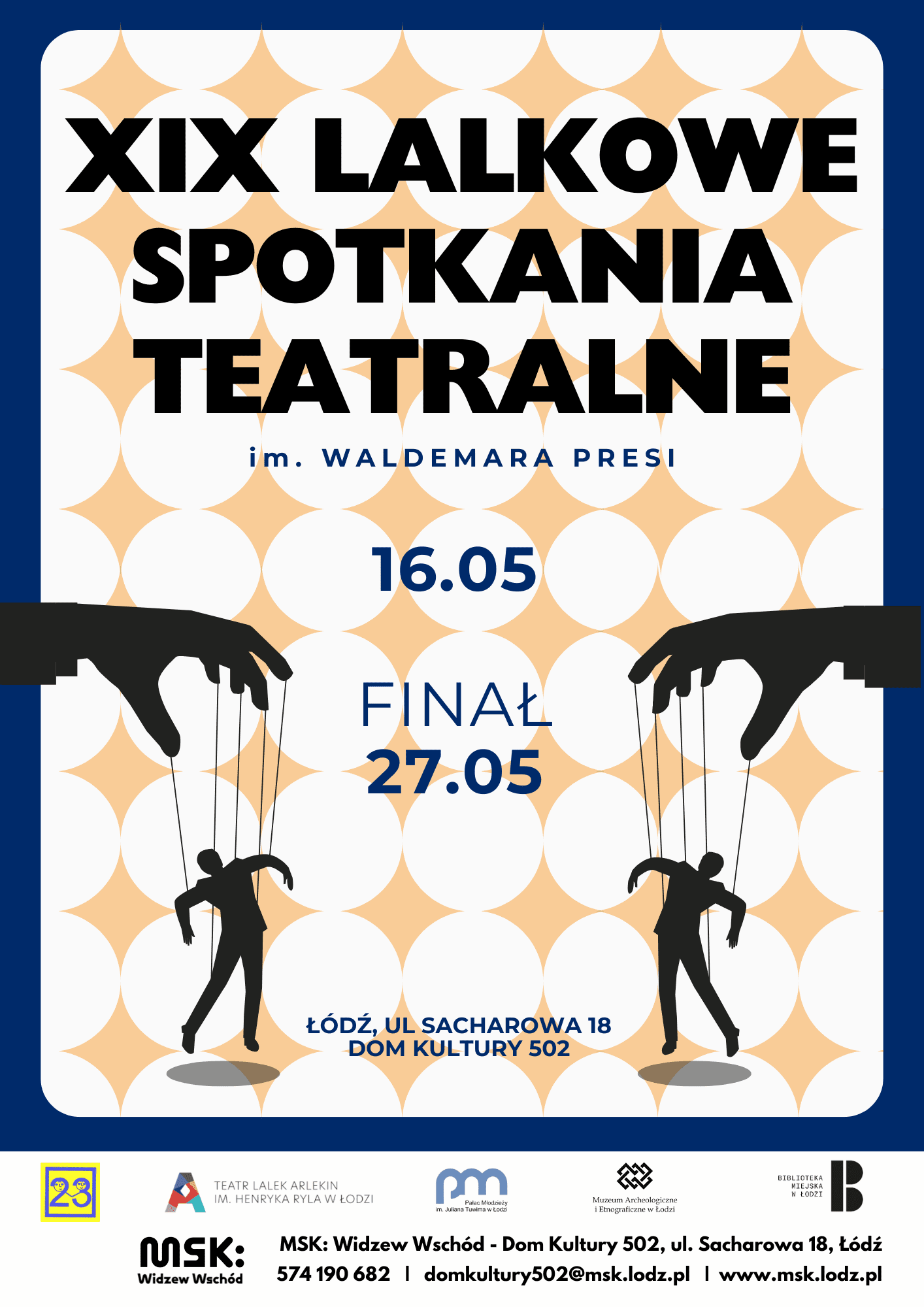 Dyrekcja SP nr 23 w Łodzi, Rada Pedagogiczna, Kierownik MSK: Widzew Wschód – Domu Kultury 502 i organizatorzy mają zaszczyt zaprosić wszystkich Miłośników Teatru, już po raz dziewiętnasty na Lalkowe Spotkania Teatralne im. Waldemara Presi.