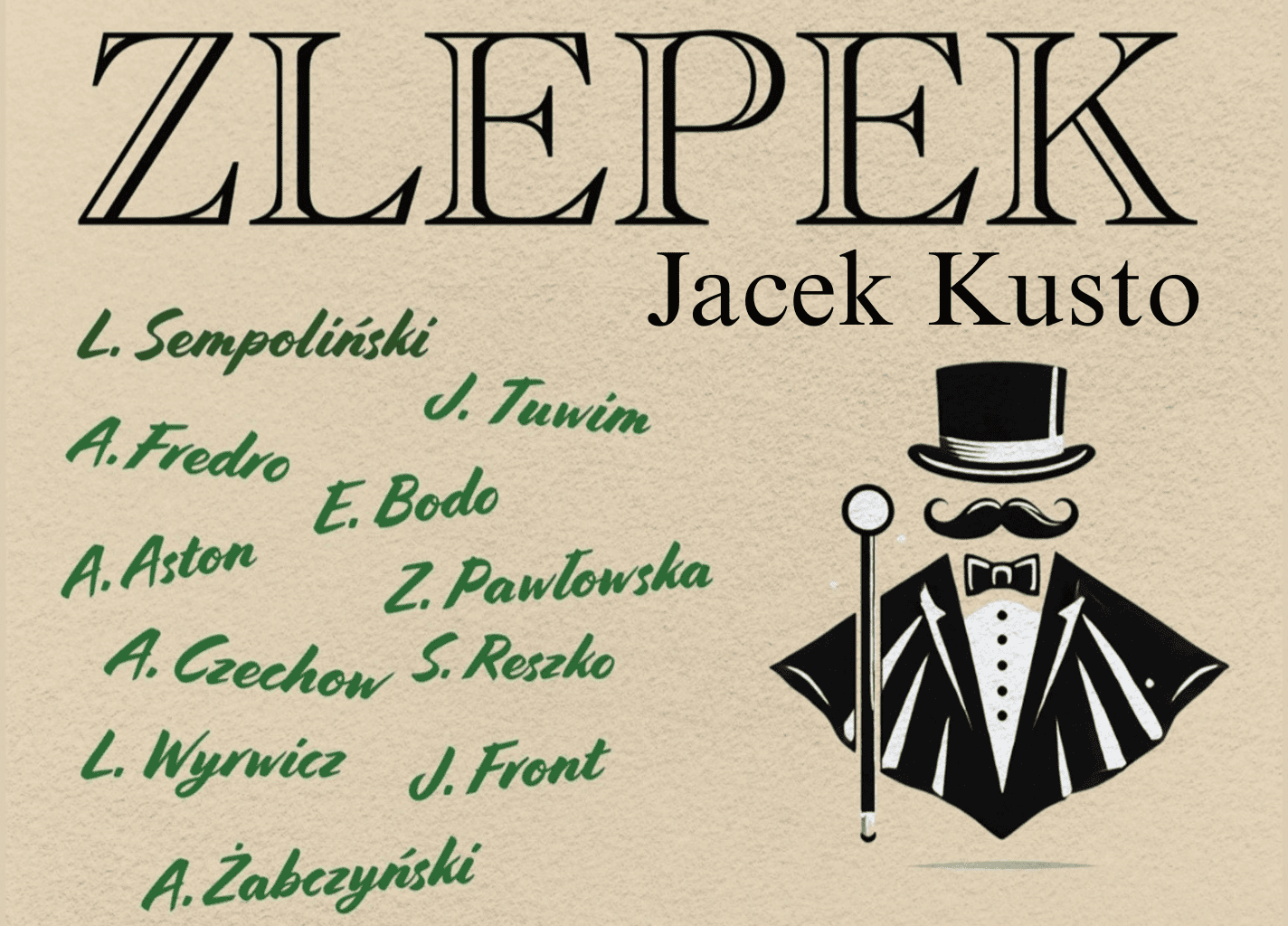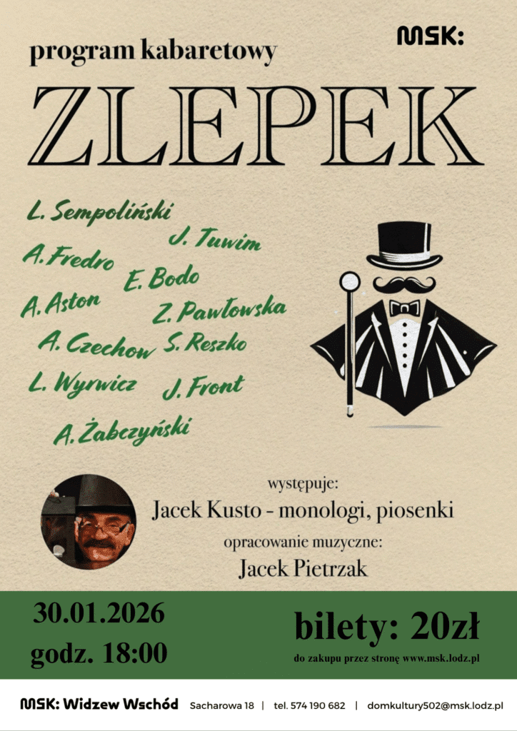 „Baby, ach te baby”, „Bo to się zwykle tak zaczyna” – te i inne przeboje w stylu retro, skecze i monologi przedwojennej i międzywojennej sceny kabaretowej, znalazły się w programie spektaklu kabaretowego „Zlepek”. Jego twórca i zarazem aktor Jacek Kusto, przypomni twórczość takich autorów jak Ludwik Sempoliński, Aleksander Żabczyński, czy Eugeniusz Bodo. Zapraszamy na wieczór pełen muzycznych wspomnień, dobrego żartu i aktorskiej finezji. Przed spektaklem będzie można obejrzeć teatralne kadry Marii Tymińskiej, łódzkiej artystki fotografki.